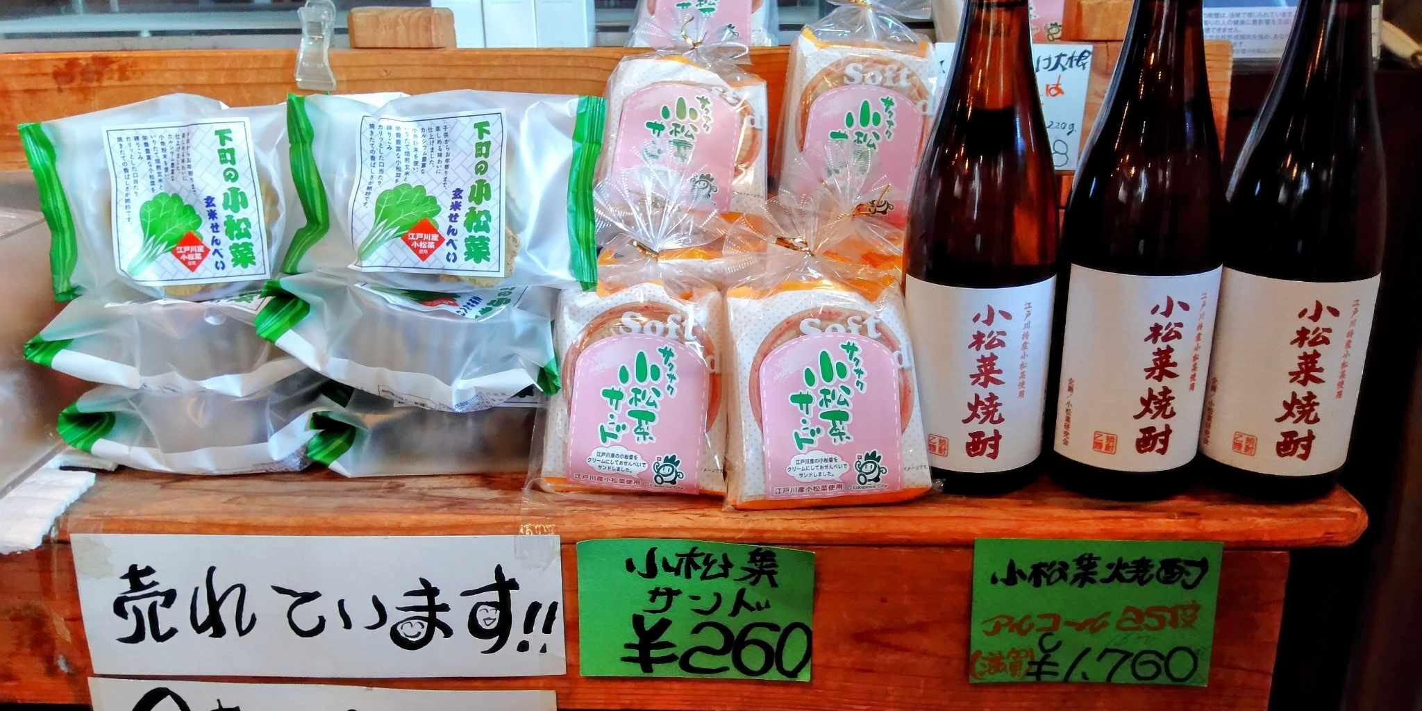 | 小松菜商品 | 小松菜焼酎(1,870 円) 小松菜せんべい(210 円)・小松菜サンド(260 円)など |