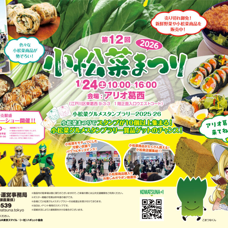2026年1月24日(土)、アリオ葛西にて『第12回小松菜まつり』を開催します! 今年も小松菜をテーマにした楽しい企画やグルメ、ステージイベントが盛りだくさん。 本日、ホームページに **特設ページ** がオープンしまし…